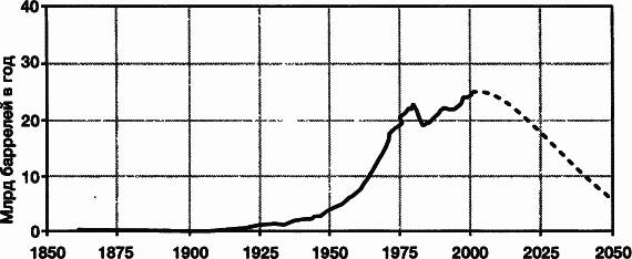 Производство нефти в мире до 2000 г. показано сплошной кривой. Методы геолога М. Кинга Хубберга (М. King Hubberth) использованы для определения наиболее вероятных объемов добычи нефти в будущем. Пунктирная линия в правой части графика отражает вероятные объемы добычи, если оставшиеся неразведанные запасы составляют примерно 1,8 трлн баррелей (площадь под пунктирной частью графика). (Источник: K.S. Deffeyes.)