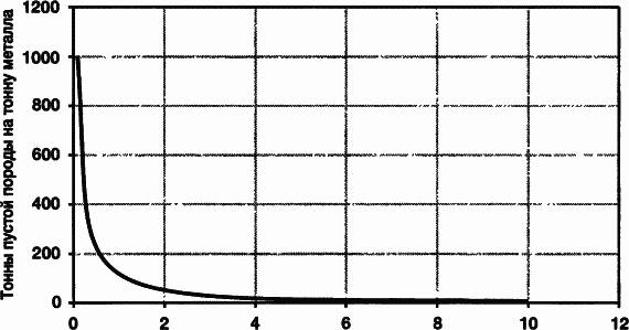 При уменьшении среднего содержания металла в руде с 8 до 3 % происходит резкое увеличение количества пустой породы в расчете на тонну конечной продукции. Если содержание упадет ниже 3 %, то объемы пустой породы возрастут многократно. Рано или поздно стоимость добычи и переработки отходов превысит выгоду от добычи металла.
