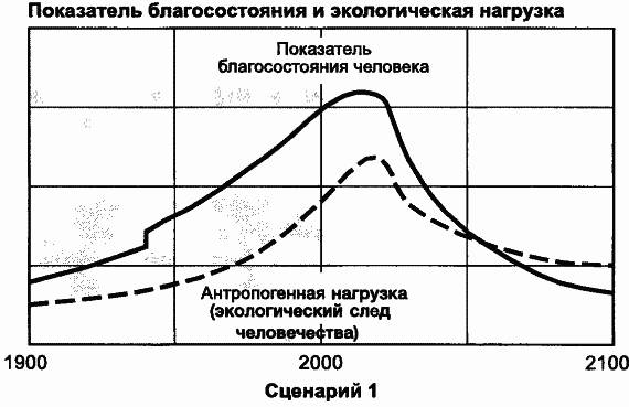 Численность населения в Сценарии 1 возрастает с 1,6 млрд чел. в 1900 расчетном году до 6 млрд в 2000 г., и превышает 7 млрд в 2030 г. Суммарное производство промышленной продукции увеличивается с 1900 по 2000 г. почти в 30 раз, а затем еще на 10 % к 2020 г. В период между 1900 и 2000 гг. расходуется не более 30 % запасов невозобновимых ресурсов планеты, к 2000 г. более 70 % ресурсов еще сохраняются невостребованными. Уровень загрязнения в моделируемом 2000 г. только-только начал существенно расти, превышая уровень 1990 г. на 50 %. Потребление промышленных товаров на душу населения в 2000 г. на 15 % больше, чем в 1990 г., и примерно в 8 раз больше, чем было в 1900 г.[151].
