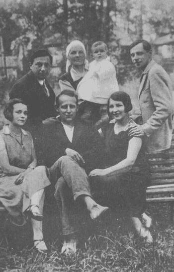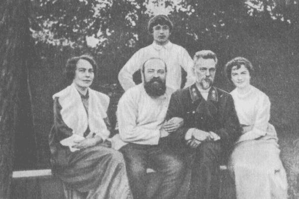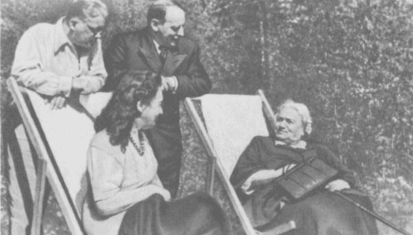 В Доме творчества «Комарово». Начало 1950-х гг. Стоят Н. Н. Никитин, К. Л. Шварц. Сидят (слева направо): Е. Г. Полонская, О. Д. Форш.