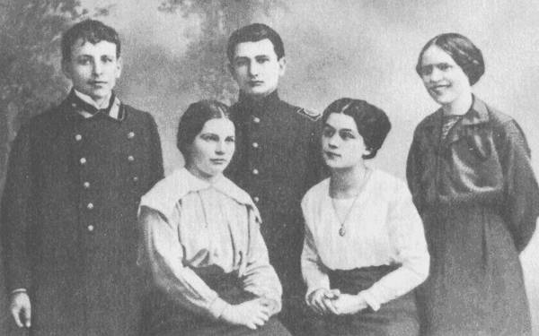 Е. Л. Шварц (во втором ряду первый слева) с друзьями юности Л. М. Оськиным и сестрами Е. Г. и М. Г. Зайченко (сидят). 1915 г.