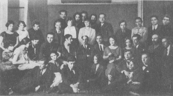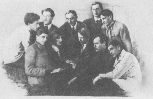 Группа ленинградских писателей «Серапионовы братья». В верхнем ряду слева направо: Л. Н. Лунц, Н. С. Тихонов, К. А. Федин, И. Я. Груздев, В. А. Каверин. В нижнем ряду: М. Л. Слонимский, Е. Г. Полонская, Н. Н. Никитин, Вс. В Иванов, М. М. Зощенко.1921–1922 г.