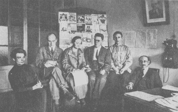 В редакции детской литературы Ленинградского отделения Госиздата. Слева направо: Н. М. Олейников, В. В. Лебедев, З. И. Лилина, С. Я. Маршак, Е. Л. Шварц, Б. С. Житков. Конец 20-х гг.