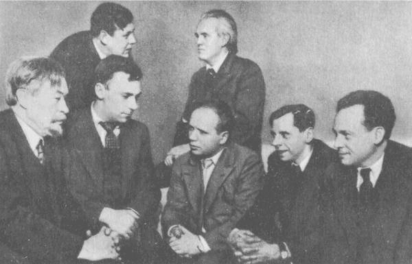 Ленинградские писатели. В нижнем ряду слева направо: В Я Шишков, Ю. П. Герман, А А. Прокофьев, М. Л. Слонимский, Ю. Н Тынянов. В верхнем ряду: Л. С. Соболев, Н. С. Тихонов.
