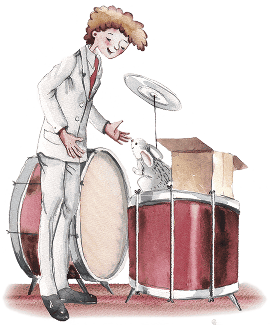 Все инструменты уже стояли на сцене. Мы пристроили коробку с кроликом на барабан и спрятались за пыльным фиолетовым занавесом.