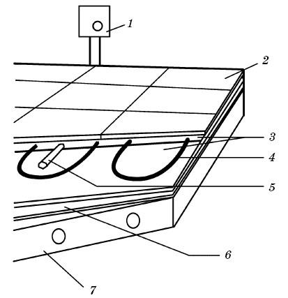 Система «теплый пол» состоит из нагревательной секции, термостата с датчиком температуры, специальных аксессуаров для облегчения и ускорения монтажа (монтажная лента, гофрированная пластиковая трубка и т. п.), теплоизоляции (рис. 10).
