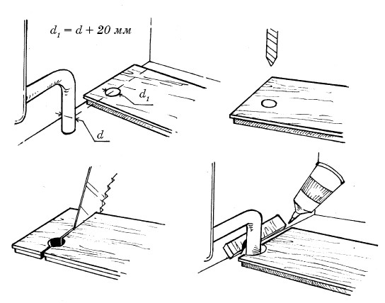 В этом положении с помощью строительного уровня можно начертить вторую линию (расстояние от труб до стены). В результате будут видны места с пересечением линий, которые и обозначат расположение отверстий под трубы. Первоначально рекомендуется с использованием специальных сверл «балерин» просверлить сами отверстия. Диаметр отверстий должен быть больше, чем диаметр труб.