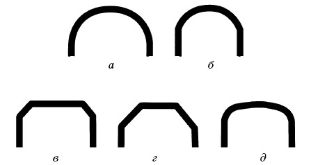 Свод арки считается наиболее трудоемкой в изготовлении частью конструкции. От ее формы главным образом зависит вид сооружения в целом. Кроме арки-портала, в зависимости от формы свода различают следующие виды арок (рис. 60):
