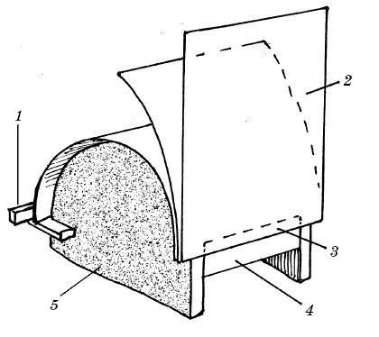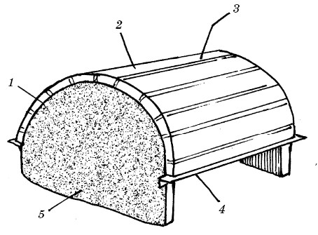 Рис. 62. Метод мокрого изгиба гипсокартона:1 – обрешетка для фиксации; 2 – изгиб (продольное направление); 3 – уголок-профиль; 4 – полоски из ГКЛ; 5 – срезанная плита