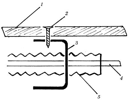 Рис. 77. Прокладка кабеля: 1 – гипсокартон;2 – саморез; 3 – вертикальная направляющая; 4 – кабель; 5 – гофротруба