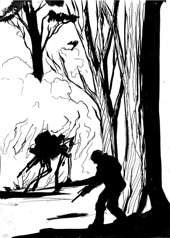В центр поляны, прямо к главному дереву Ду, на шести согнутых железных ногах, выползла ржавая шагающая бронемашина пехоты. Прикрываясь в тени её корпуса, от непрекращающейся лавины стрел и копей, по мосту семенили солдаты в потрепанной и облезлой форме с нашивками «Эспайер».