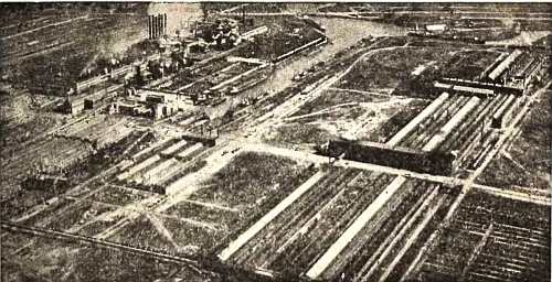 На территории фордовского завода имеются и другие подсобные предприятия, из которых главнейшие — цементный завод, дающий две с половиной тысячи бочек цемента в день, стекольный завод, выпускающий один миллион кв. метров стекла, коксовый завод, выжигающий в 240 коксовых печах 3 300 тонн кокса в день.