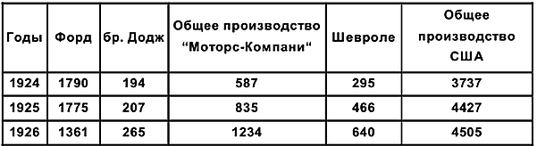 В годы, когда производство автомобилей в Америке неслыханно увеличивалось, когда производство машин «шевроле» за три года выросло более, чем вдвое, производство машин братьев Додж увеличилось в полтора раза, выпуск автомобилей избалованного монополией автомобильного короля неуклонно падал. Это была катастрофа.