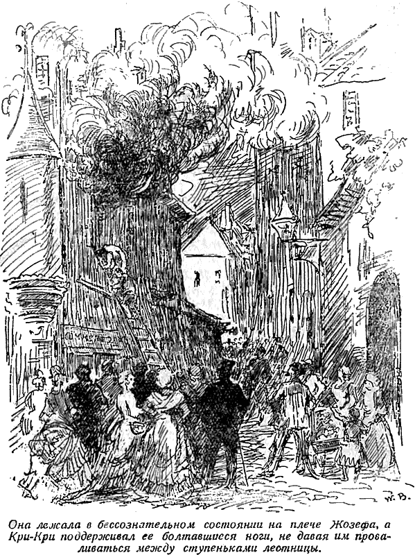 Но, когда дым и пыль рассеялись, вздохи облегчения и возгласы восхищения раздались кругом. Милле ничего не слыхала: она лежала в бессознательном состоянии на плече Жозефа, а Кри-Кри поддерживал ее болтавшиеся ноги, не давая им проваливаться между ступеньками лестницы. Вновь наступила тишина, нарушаемая лишь тревожным поскрипыванием перегруженной лестницы.