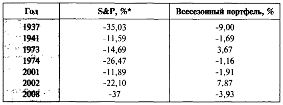 Чтобы убедиться в способности портфеля выдержать проверку временем, необходимо подвергнуть его самым жестоким испытаниям. В приведенной ниже таблице показаны семь самых масштабных биржевых крахов начиная с 1935 года. Как видите, в двух из семи случаев всесезонный портфель оказался бы еще и в выигрыше, а понесенные потери были бы относительно низкими по сравнению с американским фондовым рынком! Вот и говори после этого, что невозможно плыть против течения. В то время как экономическая зима заставила всех затянуть пояса, этот портфель позволил бы вам кататься на лыжах или сноуборде, попивая горячий шоколад!