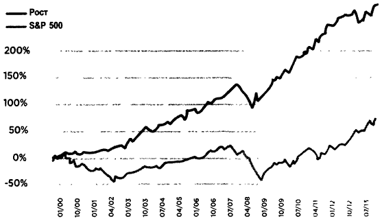 Если посмотреть, как вел бы себя всесезонный портфель по сравнению с рынком в недавнем прошлом, то обнаружится еще более заметная разница. С 1 января 2000 года по 31 марта 2014 года всесезонный портфель неизменно опережал по результатам рынок (S&P 500). В этот период мы пережили массу сюрпризов, о которых говорит Рэй: крах интернет-компаний, кредитный кризис, европейский долговой кризис, самое значительное единовременное падение цены на золото (28 процентов в 2013 году). Сюда же входит так называемое потерянное десятилетие с начала 2000 по конец 2009 года, в течение которого значение индекса S&P 500 оставалось на прежнем уровне. Взгляните на разницу в результатах.