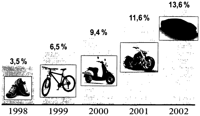 Трехпроцентным отчислениям соответствует изображение пары кроссовок, потому что это все, что вы можете себе позволить при таком уровне накоплений. При 6 процентах вы видите уже велосипед. И так продолжается дальше до 14 процентов, где можно увидеть шикарный автомобиль, ясно демонстрирующий, что жизнь удалась! Разница очевидна!