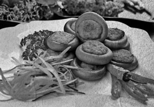 Мелко порезанные кубиками лук и морковь обжарить на растительном масле, добавить фарш и жарить до готовности. В готовый фарш добавить тертый сырок и мелко порезанную зелень, посолить и поперчить по вкусу. Тесто раскатать и порезать полосками (длина и ширина полосок зависят от того, какого размера бублики вы бы хотели получить). Выложить на тесто фарш, защипнуть края, согнуть колечком и перевернуть швом вниз. Выложить на противень смазать взбитым яйцом. В разогретой до 200 °С духовке выпекать до тех пор, пока ваши бублички не станут золотистого цвета.
