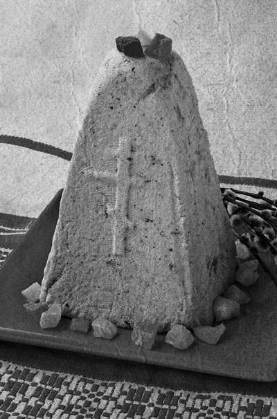 Творог протереть через сито, затем взбить с размягченным сливочным маслом и сметаной. Желтки растереть с сахаром, пока смесь не побелеет. Творожную и яичную массы смешать. Добавить цукаты, измельченные орехи и промытый изюм. Тщательно перемешать. Традиционной формой для пасхи считается сборная деревянная форма с выдавленными надписями. Застелить форму марлей в 2–3 слоя и выложить в нее творожную массу. Марлю свернуть сверху, поставить блюдечко и пресс. Оставить в холодильнике не менее чем на сутки. Лишняя влага должна будет вытечь.