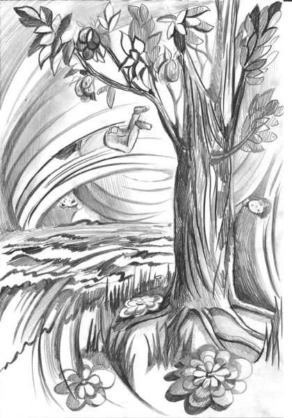 Ребята начали спускаться с вершины холма, рассматривая окружающую природу. Вокруг росли диковинные цветы, наполнявшие воздух пряным ароматом. Их путь лежал через рощу, за которой виднелся лес из высоких деревьев.