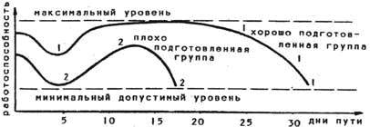 У хорошо подготовленной группы после адаптации к походным условиям работоспособность быстро восстанавливается, период максимальной работоспособности длителен, спад происходит медленно. У плохо подготовленной группы адаптация затягивается, период максимальной работоспособности краток, спад происходит быстрее. Соответственно безопасная длительность похода у первых составляет около 30 дней, у вторых — не более 18 дней.