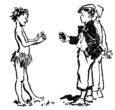 Нам так надоело дышать запахом гнилой рыбы и так захотелось посмотреть на работу каменотесов, что мы решили выбраться из землянки. Мы вышли и огляделись. Никто на нас даже внимания не обращал. Но вдруг кто-то схватил меня за ногу. Смотрю, тот мальчишка, что был со взрослыми дикарями в лесу, когда они нас в плен брали.