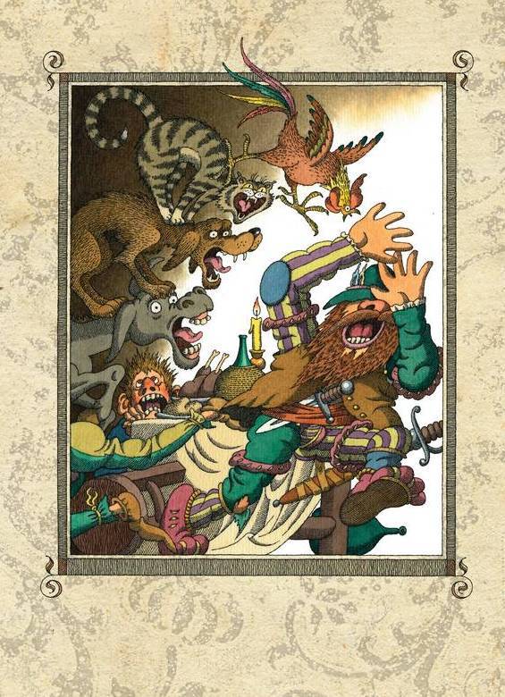 Наконец-таки нашли способ. Осёл должен был упереться передними ногами в подоконник, собака вспрыгнуть ему на спину, кошка взобраться на спину собаки, а петух должен был взлететь и сесть кошке на голову. Как условились, так по данному знаку разом и принялись за свою музыку: осёл заревел, собака залаяла, кот замяукал, а петух стал кукарекать. А потом и вломились в дом через окно, так что оконницы задребезжали. Разбойники, заслышав этот неистовый рёв, повскакивали со своих мест; им показалось, что в окно лезет какое-то страшное привидение, и они в ужасе разбежались по лесу.