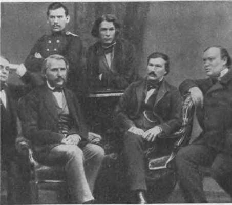 Толстой в группе писателей — сотрудников журнала «Современник» (Гончаров, Тургенев, Григорович, Дружинин, Островский).