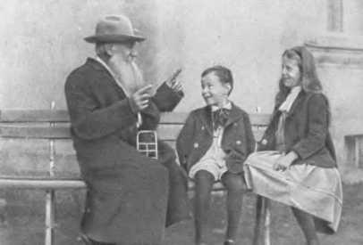 Л. Н. Толстой рассказывает внукам С. А. и И. А. Толстым сказку об огурце. Крекшино, 1909 г.