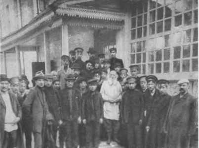 Л. Н. Толстой среди учеников Тилевских вечерних курсов для рабочих. Ясная Поляна, 1909 г.