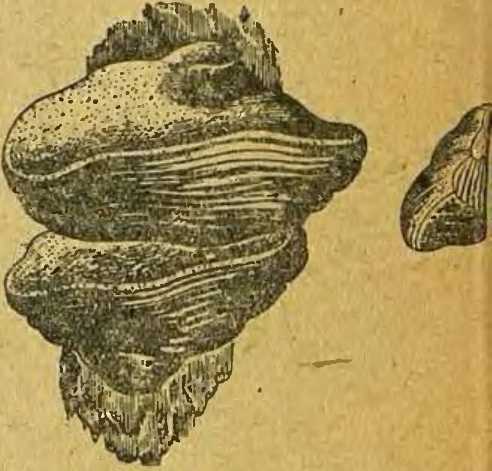Для этого служил «трут», подобрать который было очень нелегко. У нас его приготовляли например из шляпного гриба «трутовика», встречающегося на некоторых старых деревьях (рис. 5). Из гриба удаляли все твердые древесные части, потом варили его в воде, обрабатывали деревянными колотушками, чтобы размягчить, снова кипятили, на этот раз в растворе поташа, затем пропитывали селитрой и высушивали, — только тогда он был готов к употреблению. Вместо трута применяли также хлопчатобумажный фитиль, пропитанный селитрой. Еще недавно у нас в портсигарах делали специальный желобок для такого фитиля, хотя потребители этих портсигаров и не пользовались никогда для добывания огня кремнем и сталью.