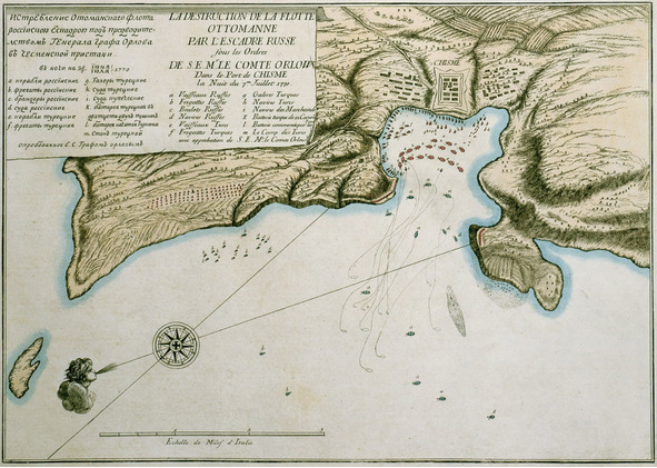 Флот султана исчез; пятнадцать кораблей, шесть фрегатов, несколько шебек, бригантин, галер и фелук, всего сто судов, сделались жертвою пламени; спасся только один, корабль с пятью меньшими судами, и то лишь потому, что безусловно отдался на волю победителей. Турков погибло более двадцати тысяч. Утреннее солнце осветило страшную картину разрушения на водах Чесменской гавани, смешавшихся с кровью и долго хранивших кровавый цвет, вспоминавший ужасную ночь с 26 на 26 июня.