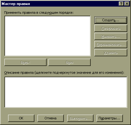 Вот вы и закончили создание одного правила обработки корреспонденции. А ведь их может быть несколько. Все они отображаются в основном списке первого окна Мастер правил и выполняются в том порядке, в котором они перечислены. Естественно, порядок выполнения правил в любой момент может быть изменен при помощи кнопок Вверх и Вниз.