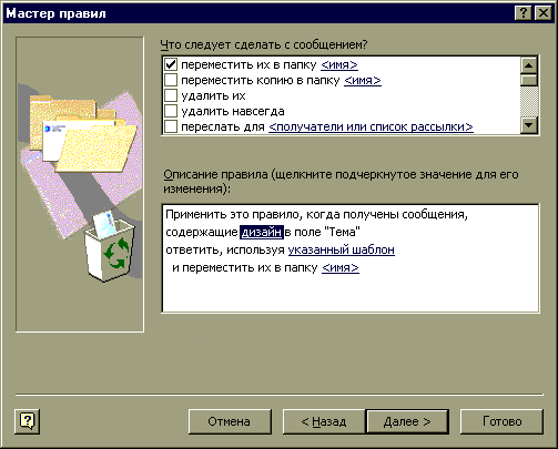 Нажатие кнопки Далее переводит вас к следующему шагу мастера. Теперь вам надо будет указать одно или несколько действий, которые нужно будет выполнить вашей почтовой программе при получении писем с указанной темой. Вы можете автоматически переместить их в какую-либо папку, удалить в папку Удаленные или сразу удалить их, переслать письма кому-либо из ваших корреспондентов, чьи данные внесены в адресную книгу, распечатать или даже автоматически ответить на них, используя специальный шаблон. И это далеко не полный перечень возможных действий.