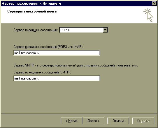 При помощи выпадающего списка Сервер входящих сообщений вы можете выбрать протокол, под управлением которого работает сервер входящей почты. А в полях текстового ввода Сервер входящих сообщений (POP3 или IMAP) и Сервер исходящих сообщений (SMTP) указать имена этих почтовых серверов и нажать кнопку Далее.