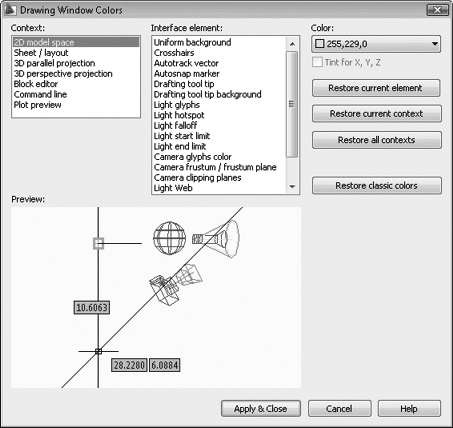 • Restore classic colors (Восстановить классические цвета) – восстанавливает цвета всех элементов интерфейса, используя классические цвета AutoCAD 2010.