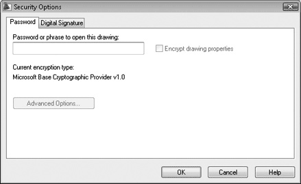 Поле Password or phrase to open this drawing (Пароль или фраза для открытия чертежа) предназначено для задания пароля. Вы можете также включить флажок Encrypt drawing properties (Шифровать свойства чертежа), чтобы запретить просмотр свойств без введения пароля.