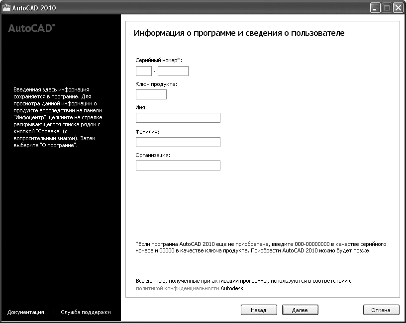 5. В поле Серийный номер (Serial Number) введите номер, выданный вам при покупке программы, или 000-00000000, чтобы использовать пробную версию AutoCAD 2010.