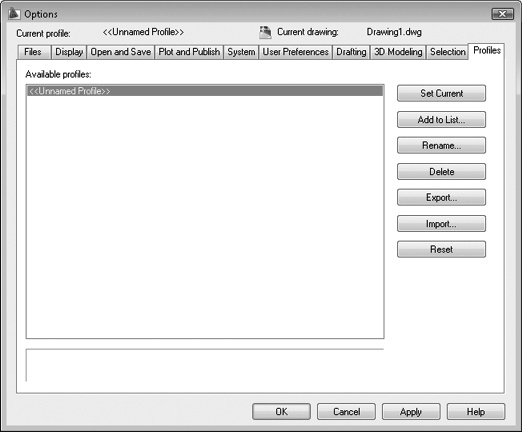 Вкладка Profiles (Профили) (рис. 2.21) позволяет создавать и сохранять профили пользователей, которые содержат набор параметров настроек системы AutoCAD.