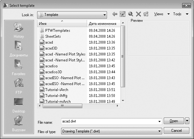 • с использованием шаблона – вы можете создать чертеж на основе стандартного или собственного файла шаблона DWT;