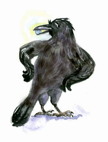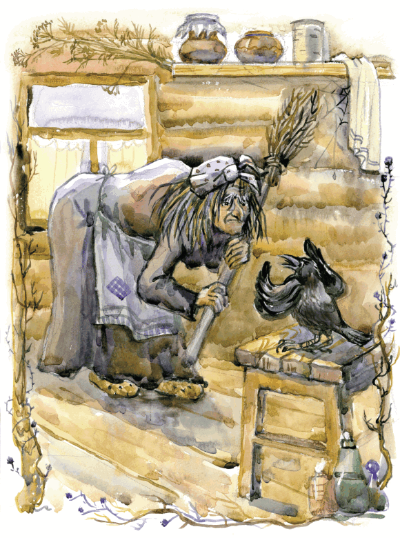 «Я не ворОна…», – хотела ответить горемыка, но не успела открыть клюв, в который угодило старухино помело. Им её из избушки и вымело. Упав на снег возле куриных ног, птица встрепенулась, поправила растрёпанные перья, хромая и оглядываясь, поковыляла в лес.