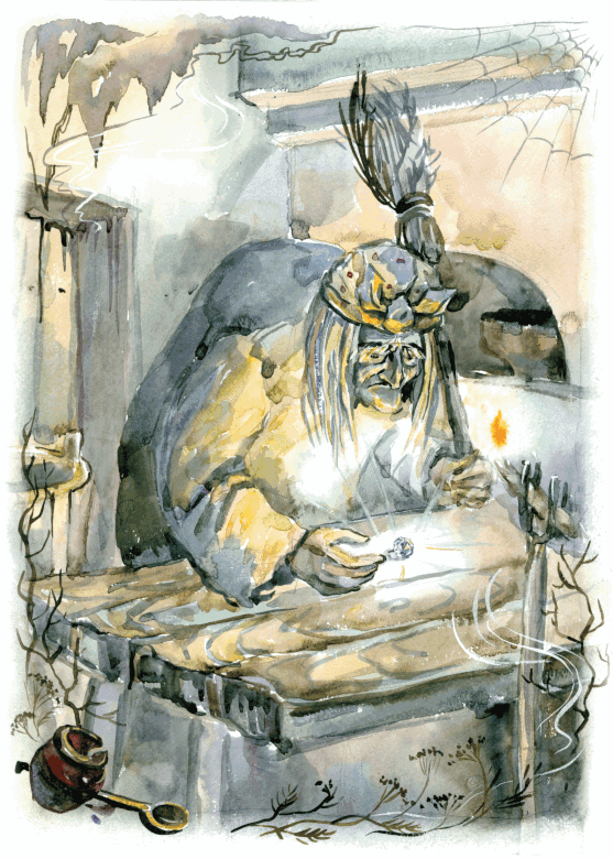 – Что ты! Ягушенька – дорогушенька! Что ты! Я от всего сердца…Яга, пыхтя и ругаясь, начала слезать с печи. Время шло, а у неё то нога зацепится, то рука соскользнёт. Наконец, свалившись на пол, она злобно сверкнула глазами и подскочила к столу. Нависла над драгоценным камушком, сгорбилась.