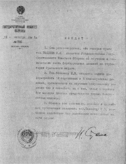 Мандат И. В. Тюленева на право формирования дивизий на территории Уральского военного округа.