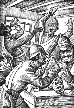 У міру того як запас спиртного зменшувався, гомін зростав. Один жандарм затіяв сварку з Ігнасіо з приводу забутого боргу, що складав десять сентаво. Двоє інших сіли обійнявшись на долівку і оплакували своє нещасливе сімейне життя. Августіно пишномовно викладав власні філософські погляди, в основі яких лежала думка, що мовчання — золото. А Педро Зурита, розчулившись, доводив, що всі люди — брати.
