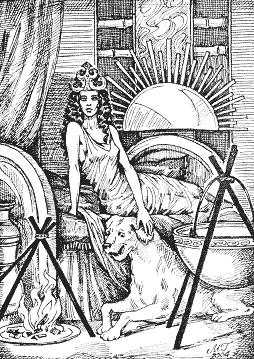 Перед жінкою на підлозі стояли два золотих триніжки; під одним жеврів вогонь, а на другому, значно більшому, височів величезний золотий казан. Між триніжками, не кліпаючи і не рухаючись, ніби сфінкс, лежав величезний, білий як сніг, собака, схожий на вовкодава. Побачивши гостей, він вп’явся в них.