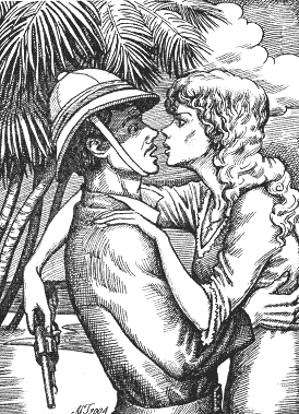 І тільки він устиг сказати собі, що, взагалі, йому байдуже, скільки часу триватиме ця ніжна сцена, як дівчина раптом відхилилася від нього, обличчя її знову спалахнуло гнівом і, загрозливо змахнувши револьвером, вона вказала йому на човен.