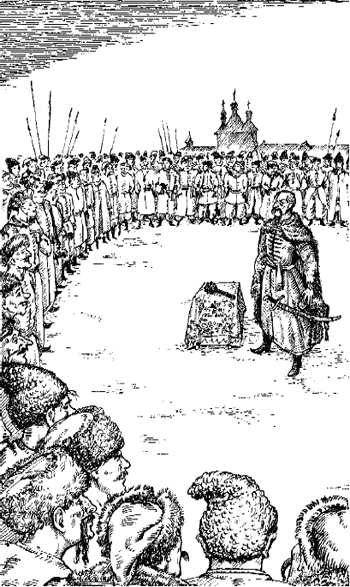 Степан Білий, теж огрядний, як і попередній суддя, чоловік у чорній важкій киреї, застебнутій на грудях срібною пряжкою, крутив на всі боки круглою, як казан, головою: вдавав, що здивований, чи був здивований справді. Його високі, дугасті брови вигнулися ще дужче, довгі вуса обвисли. А що його ймення гукали все голосніше, вибрався з людського тлуму й почовгав до свого куреня. Не мусив лишатися тут, аби не забоявся хто виказати про нього лихе. Одначе з натовпу вибігло кілька чоловік, перейняли й попідруки повели назад. Він орав ногами втоптаний сніг, упирався, й теж не розібрати: вдавано, за звичаєм, чи насправжки. А його штовхали в плечі, штурхали в потилицю, примовляючи: