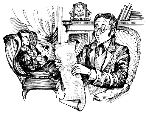 Відкинувшись на спинку крісла, Холмс зімкнув кінці пальців і з виглядом цілковитої покори перед долею заплющив очі. Доктор Мортімер повернувся до світла і високим скрипливим голосом почав читати нам цікаву повість про події давнини: