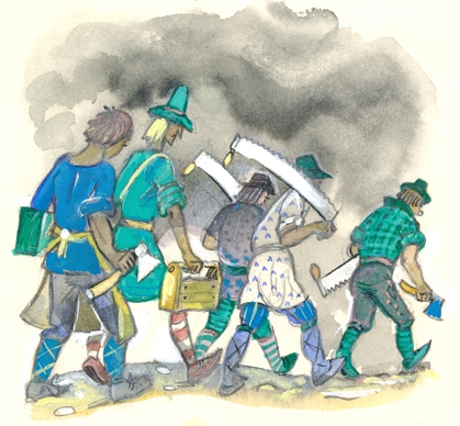 Те вървяха със запретнати ръкави, готови за работа — в престилки, с триони, рендета и сандъчета под мишница. От двете страни на процесията яздеха гвардейци. Те сдържаха конете, на които се искаше да препуснат.