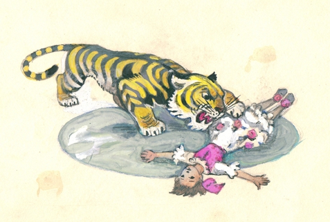 Но… тигрите се приближиха, единият наведе едрочелата си глава, помириса, другият докосна с котешка лапа момичето, третият дори не обърна внимание, притича покрай нея и застанал пред трибуната, заръмжа срещу шишковците.